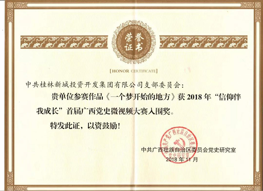 近日,在廣西壯族自治區(qū)黨委黨史研究室、廣西電視臺主辦的“信仰伴我成長”首屆廣西黨史微視頻大賽頒獎儀式上,新城投資集團(tuán)黨支部選送的參賽作品《臨桂新區(qū) 一個(gè)夢開始的地方》榮獲入圍獎。