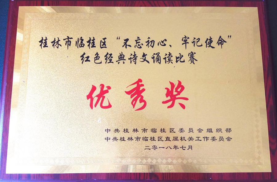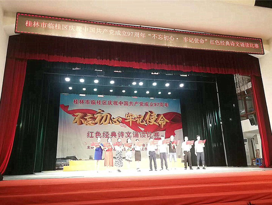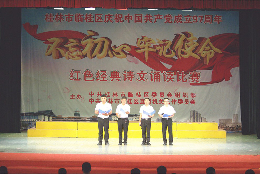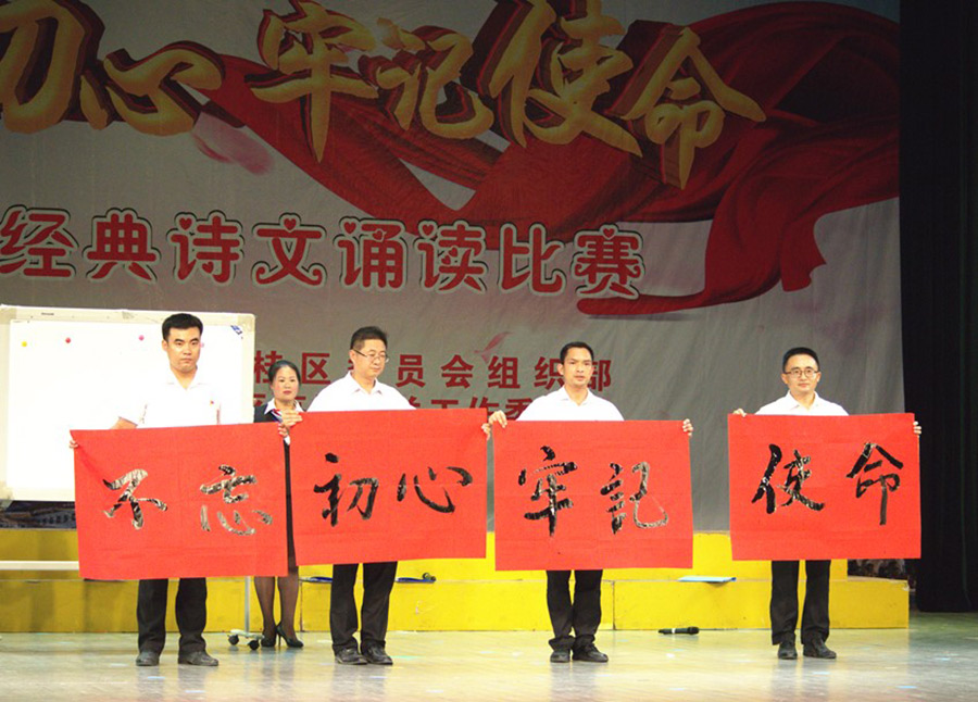 活動(dòng)中,選手們通過朗誦紅色經(jīng)典詩詞,深情回顧黨的光輝歷程、謳歌黨的豐功偉績,真誠地表達(dá)了對(duì)黨、對(duì)祖國的擁護(hù)與熱愛之情。參賽選手們儀態(tài)莊重大方,朗誦聲情并茂,以配樂、舞蹈、書法展示等多種形式,或深情款款、或激情高昂,用飽滿的熱情將紅色經(jīng)典的內(nèi)涵精彩地展現(xiàn)在觀眾面前,充分展示了臨桂區(qū)廣大黨員干部的良好精神風(fēng)貌。新城投資集團(tuán)黨支部四名黨員聲情并茂地共誦《不忘初心,牢記使命,我們永遠(yuǎn)在路上》,節(jié)目形式新穎,選手感情充沛,朗讀完詩歌后,黨員譚佳璐現(xiàn)場(chǎng)飽含情感的用毛筆書寫了“不忘初心,牢記使命”八個(gè)大字,表達(dá)了黨員們樹立遠(yuǎn)大的理想、力爭上游、為祖國的強(qiáng)盛貢獻(xiàn)力量的決心。與其說這是紅色經(jīng)典詩文誦讀,不如說這是一次視聽盛宴,更是黨員們愛黨愛國的精彩演繹。