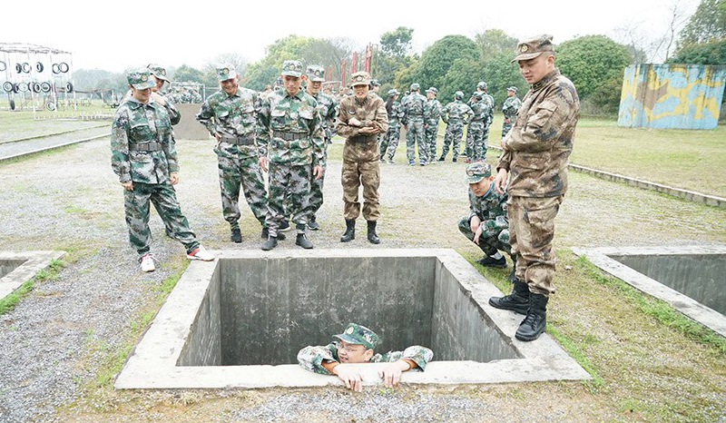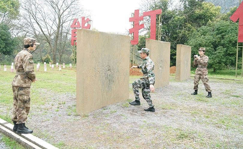 “敬禮、立正、稍息、跨立、停止間轉(zhuǎn)法!”嘹亮的軍事訓(xùn)練口號在操場上響起。天空飄著細雨,但沒有一人叫苦叫累,大家仔細聽教官對每個動作的分解講解,認(rèn)真領(lǐng)會并糾正動作,每一個動作都力爭規(guī)范標(biāo)準(zhǔn)。400米障礙軍事技能場上,教官展示完后,大家都不甘示弱,分組嘗試完成跨樁、深坑、矮墻、高板跳臺、云梯、獨木橋、高墻、低樁網(wǎng)單等項目。中午訓(xùn)練結(jié)束后,大家在教官的帶領(lǐng)下進行了飯前一首歌的拉歌準(zhǔn)備。大家嚴(yán)格按用餐紀(jì)律,等候不說話、打飯按順序、餐后自己洗碗。飯后,大家用半小時參觀了基地內(nèi)務(wù),然后又進入緊張的訓(xùn)練中。