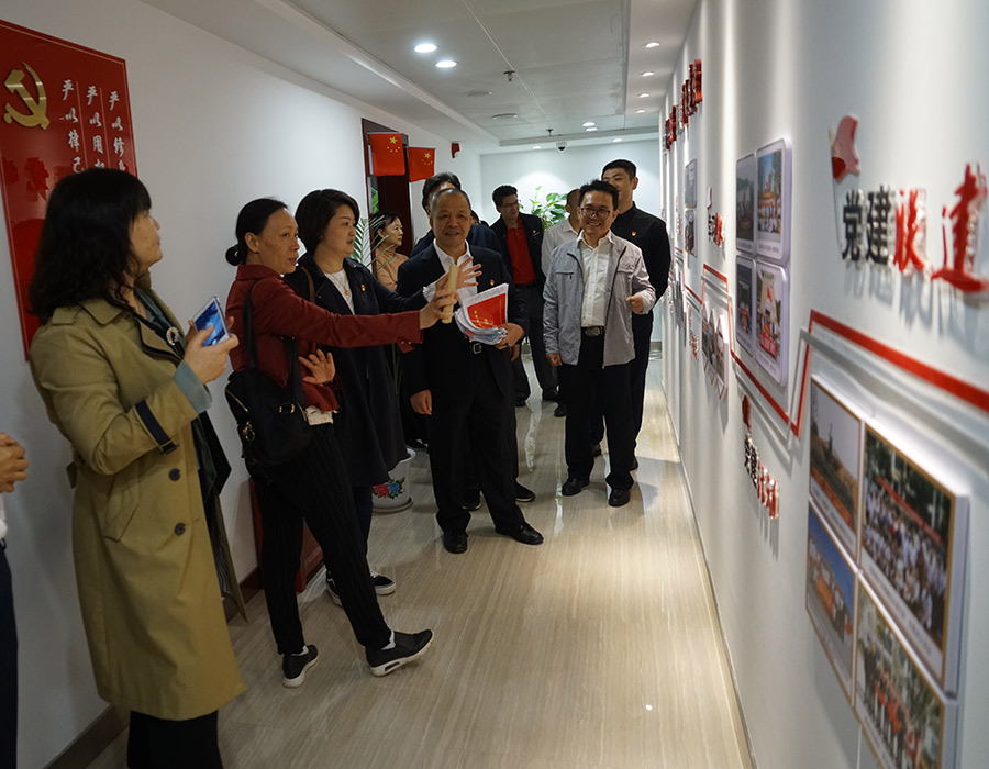 在一樓黨群展示區(qū),肖揚(yáng)燕駐足觀看了公司黨建宣傳片,強(qiáng)烈感受到新城投資集團(tuán)黨支部狠抓黨建、促融資建設(shè)、提員工精神面貌的實(shí)際成效。依次參觀了新城投資集團(tuán)企業(yè)簡介、企業(yè)文化、集團(tuán)大事記、集團(tuán)組織架構(gòu)、黨務(wù)公開欄、工會和共青團(tuán)介紹等版塊,不時(shí)與周書記探討與互動。在十五樓,肖揚(yáng)燕被走廊兩邊的黨建氛圍營造展示墻、辦公室門口的“黨員心語”以及黨員會議室濃濃的黨建氛圍所吸引,給予高度評價(jià)。她說,自己從事基層黨務(wù)工作多年,走訪了那么多單位,今天看到的新城投資集團(tuán)黨建展示區(qū)是做得最好的、最有亮點(diǎn)的,充分感受到新城投資集團(tuán)真正將抓黨建付諸于行動和實(shí)踐。桂林市黨群服務(wù)中心選址在新城投資集團(tuán)辦公大樓一樓,整棟樓黨建氛圍濃、設(shè)計(jì)起點(diǎn)高、品位雅致、內(nèi)涵豐富,值得臨桂區(qū)直機(jī)關(guān)工委組織下屬單位黨組織過來觀摩學(xué)習(xí)。