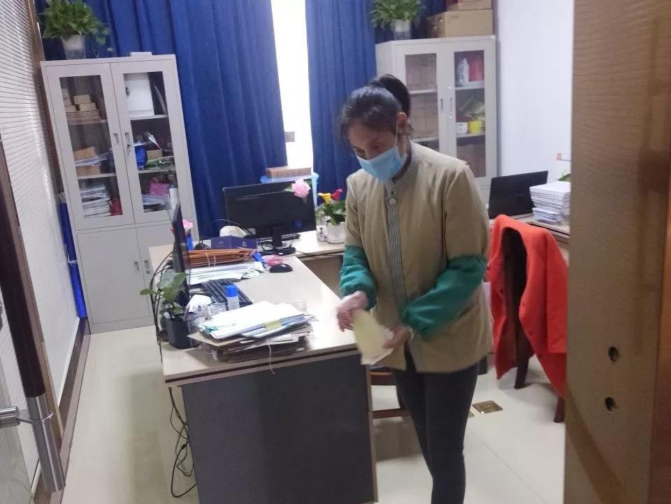 ▲保潔人員在對各門把手、茶水吧臺、辦公區(qū)域全面消毒。