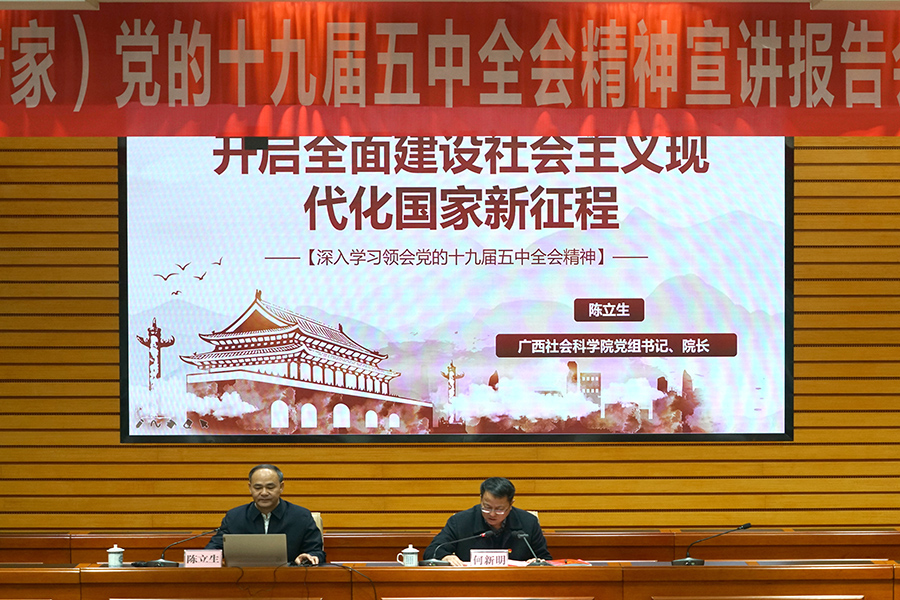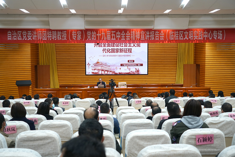 11月27日上午,自治區(qū)黨委講師團(tuán)黨的十九屆五中全會(huì)精神宣講報(bào)告會(huì)在臨桂新區(qū)工委會(huì)議室舉行。廣西社會(huì)科學(xué)院黨組書記、院長陳立生作了題為“開啟全面建設(shè)社會(huì)主義現(xiàn)代化國家新征程”宣講。臨桂新區(qū)工委第一副書記、管委會(huì)主任、臨桂區(qū)區(qū)委書記何新明主持報(bào)告會(huì),并作臨桂新區(qū)黨的十九屆五中全會(huì)精神學(xué)習(xí)動(dòng)員講話。