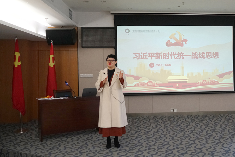 2020年12月31日,桂林新城投資集團(tuán)黨總支統(tǒng)戰(zhàn)委員張新悅以“習(xí)近平新時(shí)代統(tǒng)一戰(zhàn)線思想”為主題,給集團(tuán)公司第二黨支部黨員、發(fā)展對(duì)象、入黨積極分子,分管部室、子公司負(fù)責(zé)人上了一堂專題黨課。