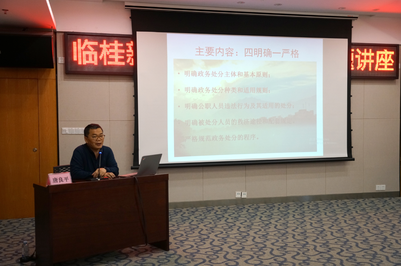 唐良平從《公職人員政務處分法》的背景和意義,以及政務處分的基本原則、適用對象、種類和程序等主要內(nèi)容進行了全面深入的闡述,通過結(jié)合實際案例,對《公職人員政務處分法》的十大問題及法律條文進行了重點解讀,提出學法用法關(guān)鍵在于實踐。