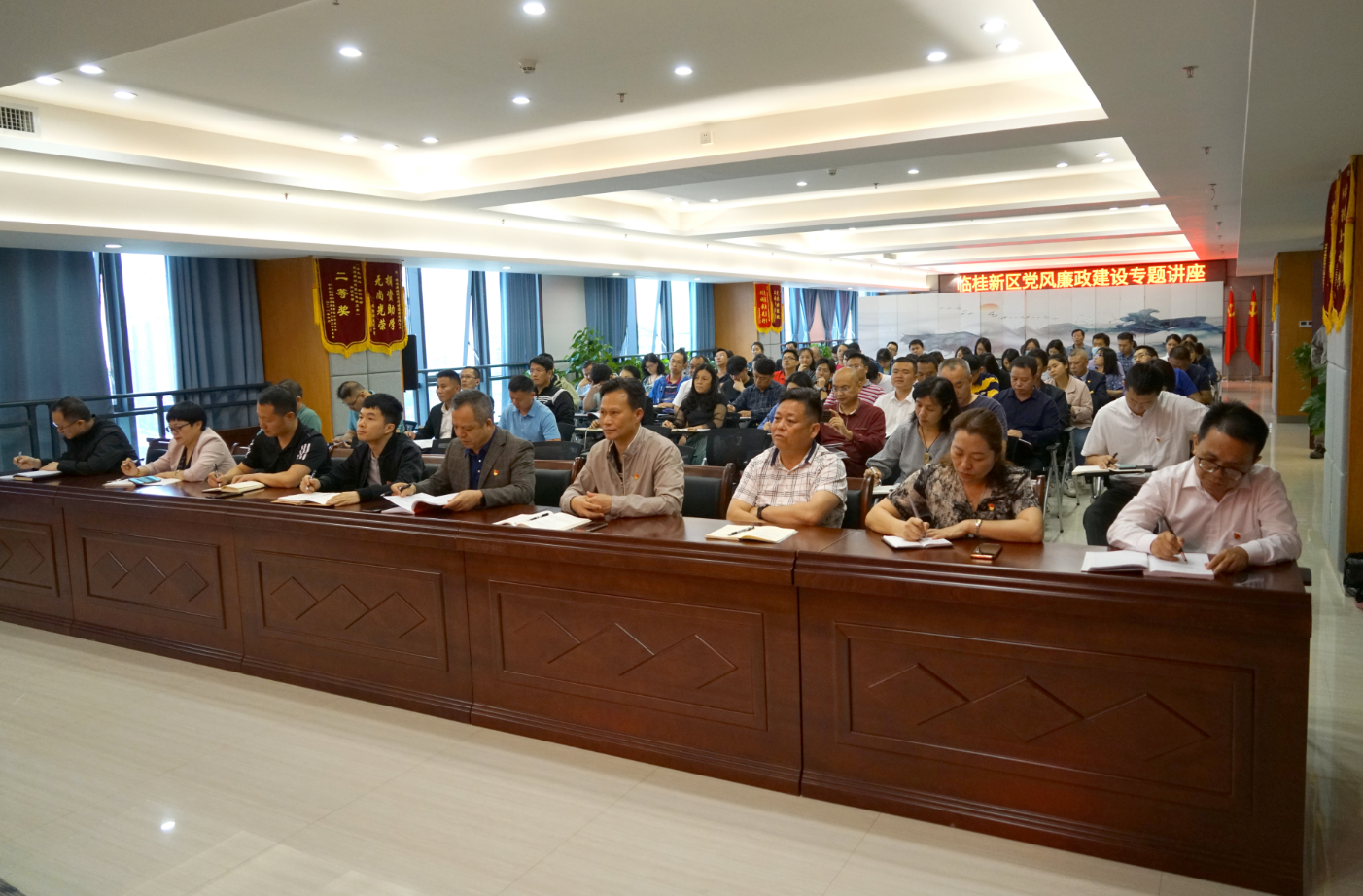 臨桂新區(qū)管委各部室負責人及人員、新城投資集團班子成員及中層干部參加會議。