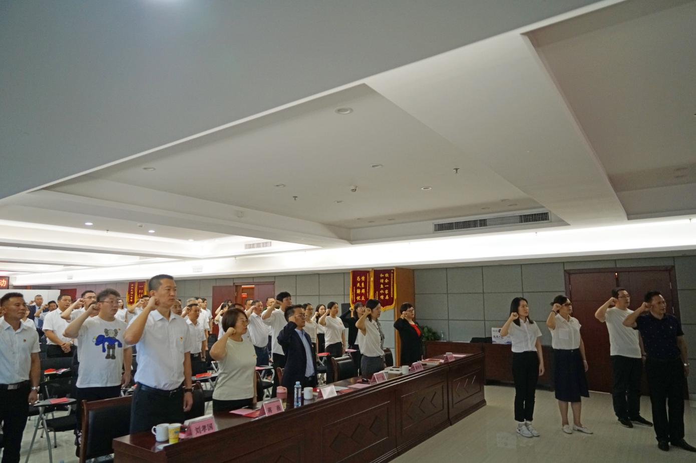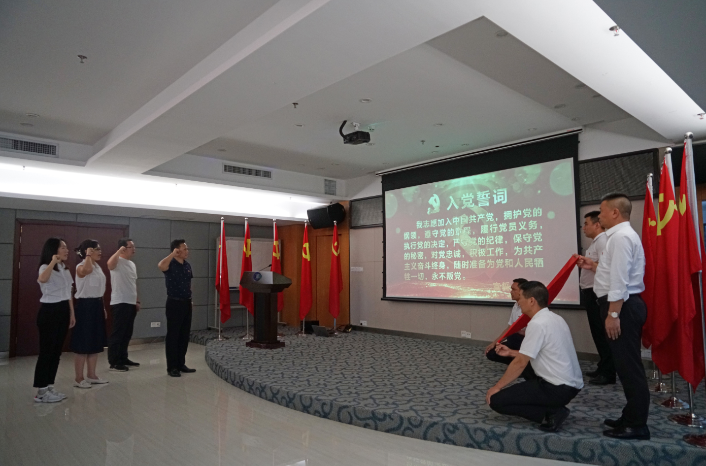 為引導(dǎo)黨員繼承發(fā)揚(yáng)老一輩革命家光榮傳統(tǒng),激發(fā)新黨員激情斗志,會(huì)場組織新發(fā)展的3名黨員周恒旭、劉萍、梁慧穎舉行了入黨宣誓,同時(shí),全體黨員重溫入黨誓詞。