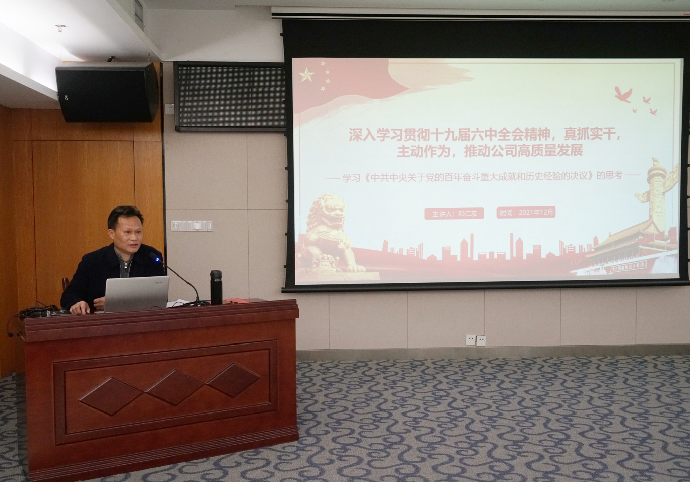 集團(tuán)黨總支副書記、副總經(jīng)理鄧仁友,黨總支組織委員、工會主席譚力源,黨總支統(tǒng)戰(zhàn)委員、副總經(jīng)理張新悅分別以《深入學(xué)習(xí)貫徹十九屆六中全會精神,真抓實(shí)干,主動作為,推動公司高質(zhì)量發(fā)展》《學(xué)習(xí)貫徹黨的十九屆六中全會精神——我們走在趕考的大路上》《十九屆六中全會公報(bào)》為主題,圍繞學(xué)習(xí)貫徹十九屆六中全會精神和全會通過的《中共中央關(guān)于黨的百年奮斗重大成就和歷史經(jīng)驗(yàn)的決議》,從深刻認(rèn)識黨的十九屆六中全會的重大意義,黨的百年奮斗歷史經(jīng)驗(yàn)和新時代中國特色社會主義的歷史性成就等方面進(jìn)行了深入解讀。