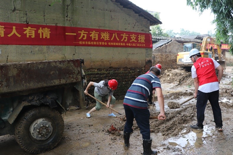 近期,臨桂新區(qū)鄉(xiāng)村振興聯(lián)系點(diǎn)五通鎮(zhèn)羅江村連續(xù)遭遇多輪強(qiáng)降雨侵襲,鄉(xiāng)村路面房屋受災(zāi)嚴(yán)重,村落存在大量積水和淤泥。面對(duì)災(zāi)情,臨桂新區(qū)黨工委委員、管委會(huì)常務(wù)副主任李星明,新區(qū)黨工委委員、管委會(huì)副主任、機(jī)關(guān)黨委書記蔣玖明了解情況后,急群眾所急、想群眾所想,立即把這項(xiàng)艱巨任務(wù)交給了新城投集團(tuán)黨總支,建議由會(huì)展中心項(xiàng)目部臨時(shí)聯(lián)合黨支部作為實(shí)施主體。新城投集團(tuán)黨總支副書記、總經(jīng)理黃峻按照部署立刻布置相關(guān)工作,安排集團(tuán)黨總支組織委員、工會(huì)主席、聯(lián)合黨支部副書記譚力源組織聯(lián)合黨支部成員單位——中建八局廣西公司桂林項(xiàng)目部具體緊急落實(shí),要求發(fā)揮央企技術(shù)優(yōu)勢(shì)和國企平臺(tái)資源,為鄉(xiāng)村災(zāi)后重建做好服務(wù)保障、力所能及的為村民解憂,以此提升“黨旗映勝地”黨建品牌的時(shí)代內(nèi)涵。