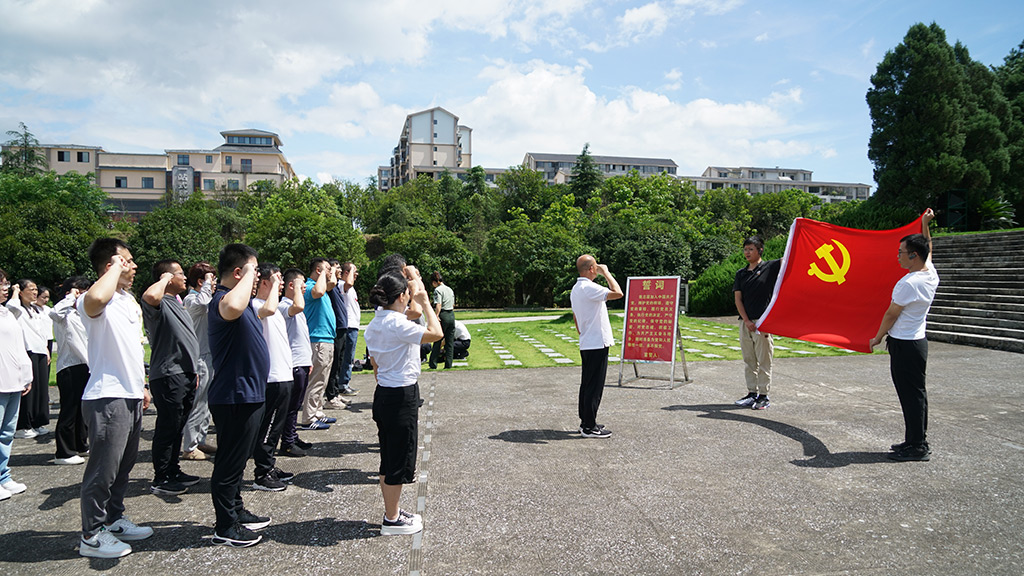 青山處處埋忠骨,何須馬革裹尸還。黨員們首先來到湘江戰(zhàn)役紀念碑前,向烈士紀念碑敬獻花籃并深深地三鞠躬,以表對革命烈士最崇高的敬意,黨員同志面向黨旗重溫入黨誓詞,追憶入黨初心。