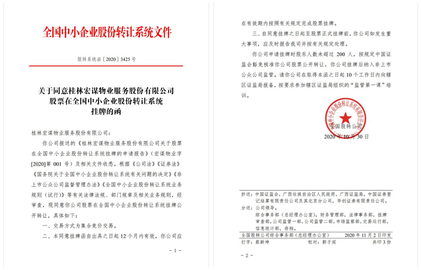 2020年12月9日下午,桂林新城投資開發(fā)集團有限公司下屬子公司桂林宏謀物業(yè)服務股份有限公司在全國中小企業(yè)股份轉(zhuǎn)讓系統(tǒng)即新三板上市。桂林宏謀物業(yè)服務股份有限公司(股票簡稱:宏謀物業(yè);股票代碼:873532)成為桂林市第一家在新三板上市的國企物業(yè)公司。
