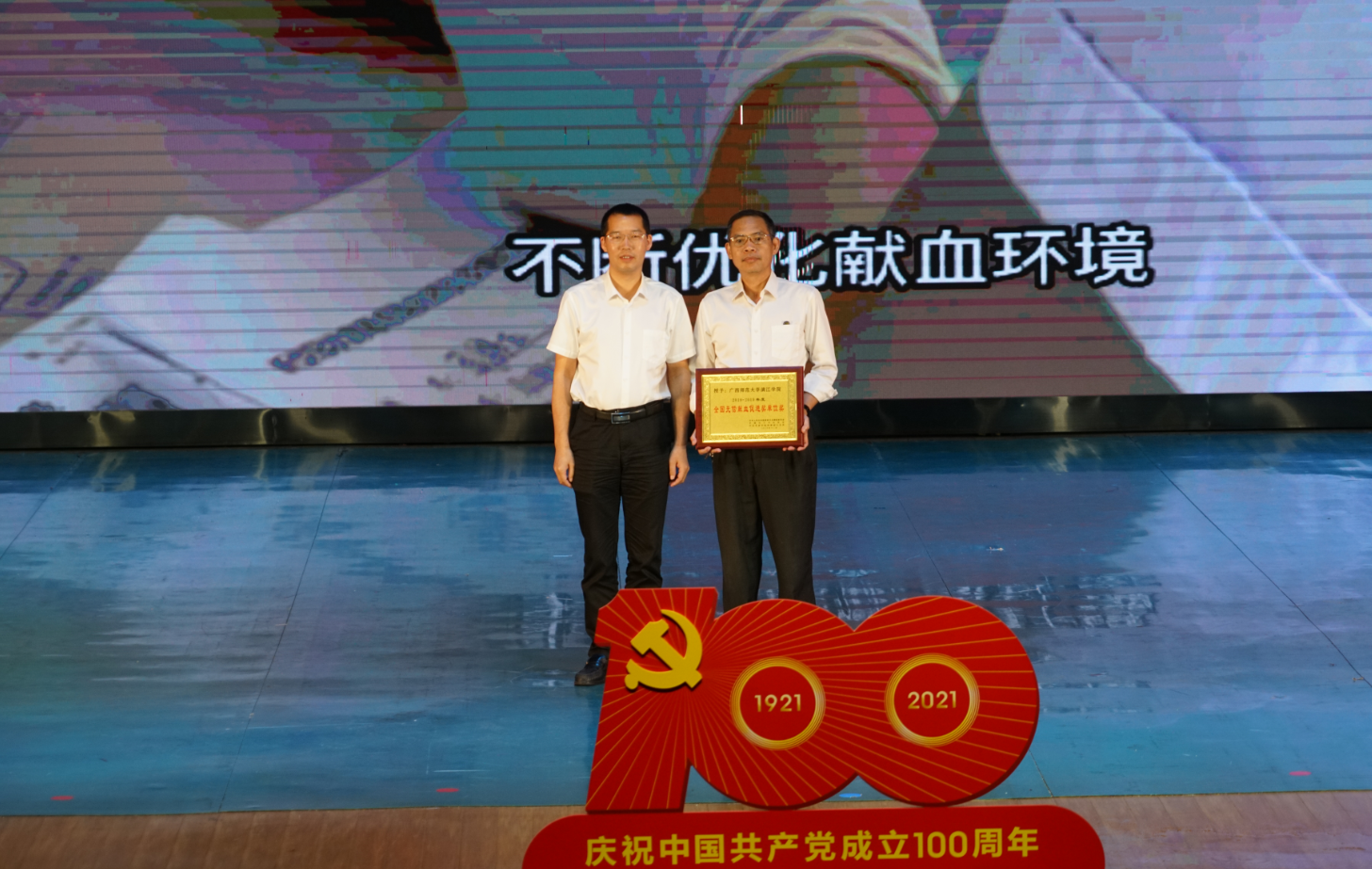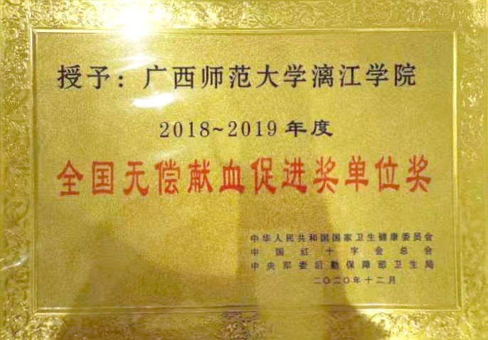 6月9日,由桂林市獻(xiàn)血委員會、桂林市衛(wèi)生健康委員會、桂林市紅十字會、中國人民解放軍聯(lián)勤保障部隊桂林聯(lián)勤保障中心衛(wèi)勤處主辦,桂林市中心血站、廣西師范大學(xué)漓江學(xué)院承辦的“喜迎建黨100周年桂林市慶祝2021年世界獻(xiàn)血者日無償獻(xiàn)血表彰文藝匯演”活動在漓江學(xué)院召開。漓江學(xué)院獲得全場唯一“全國無償獻(xiàn)血促進(jìn)獎單位獎”。