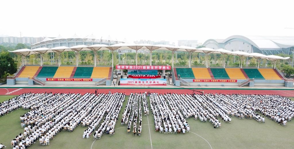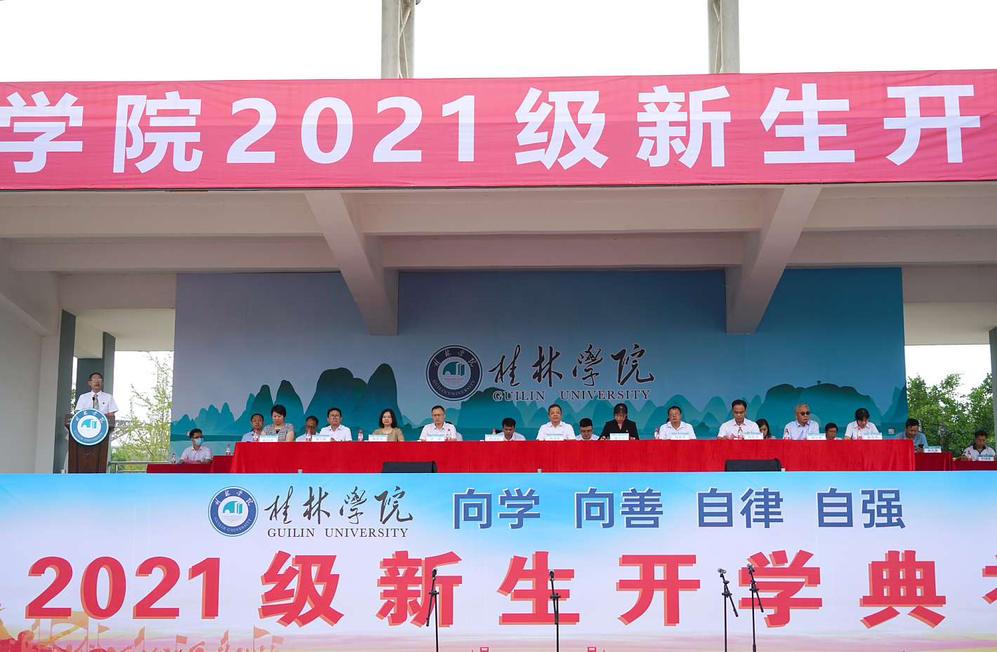 9月17日上午,桂林學(xué)院2021級新生開學(xué)典禮在學(xué)校田徑場舉行。2021級來自全國各地的3160名新生和新生親友通過現(xiàn)場與視頻直播相結(jié)合的形式,共同參加和觀看了開學(xué)典禮。桂林學(xué)院董事長周道林,桂林學(xué)院校長楊樹喆以及學(xué)校董事、監(jiān)事、校領(lǐng)導(dǎo)出席典禮。各二級學(xué)院、職能教輔部門主要負責(zé)人,各黨總支書記、副書記,全體新生輔導(dǎo)員,教師代表,校友代表參加典禮。開學(xué)典禮由校黨委書記唐文紅主持。