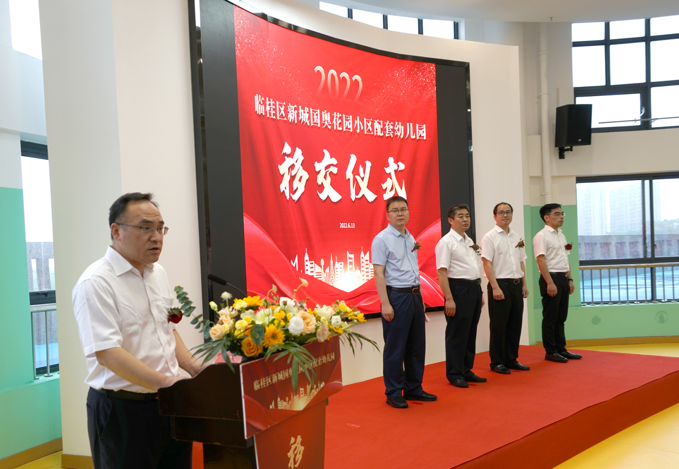 2022年6月13日,桂林市臨桂區(qū)新城國奧花園小區(qū)配套幼兒園交接儀式在幼兒園室內(nèi)小禮堂舉行。市機關(guān)事務(wù)管理局黨組書記、二級巡視員吳殷丹,市機關(guān)事務(wù)管理局局長戴波,臨桂新區(qū)黨工委委員、管委會常務(wù)副主任李星明,臨桂區(qū)常務(wù)副區(qū)長周波,新城投集團(tuán)黨總支副書記、總經(jīng)理黃峻出席交接儀式。活動由臨桂區(qū)蔣東兵副區(qū)長主持。