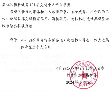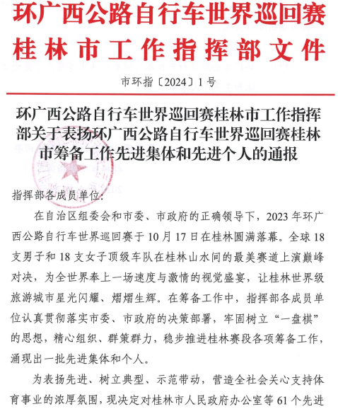 近日,根據(jù)《環(huán)廣西公路自行車世界巡回賽桂林市工作指揮部關(guān)于表?yè)P(yáng)環(huán)廣西公路自行車世界巡回賽桂林市籌備工作先進(jìn)集體和先進(jìn)個(gè)人的通報(bào)》(市環(huán)指[2024]1號(hào))獲悉,新城投集團(tuán)下屬宏謀物業(yè)公司李楓彥同志獲環(huán)廣西公路自行車世界巡回賽桂林市籌備工作先進(jìn)個(gè)人。