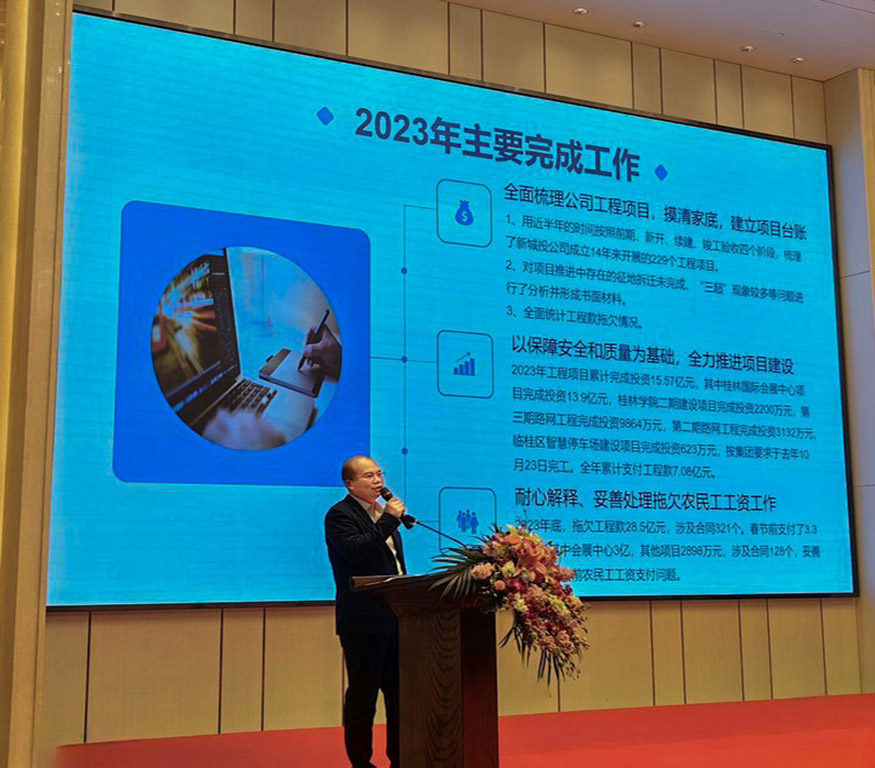最后,朱毅在會上對公司一年來的發(fā)展進行了全面的總結(jié),從“活下去”、“站起來”、“走出去”三個方面描繪了2024年的發(fā)展思路,同時分析了面臨的嚴峻形勢,也對大家提出了希望和更高的要求,希望大家在城建集團的領導下,團結(jié)一心,共同努力,為公司的美好未來貢獻自己的力量和智慧!