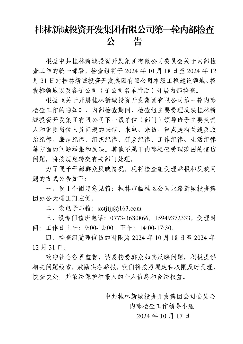 桂林新城投資開發(fā)集團(tuán)有限公司第一輪內(nèi)部檢查公告