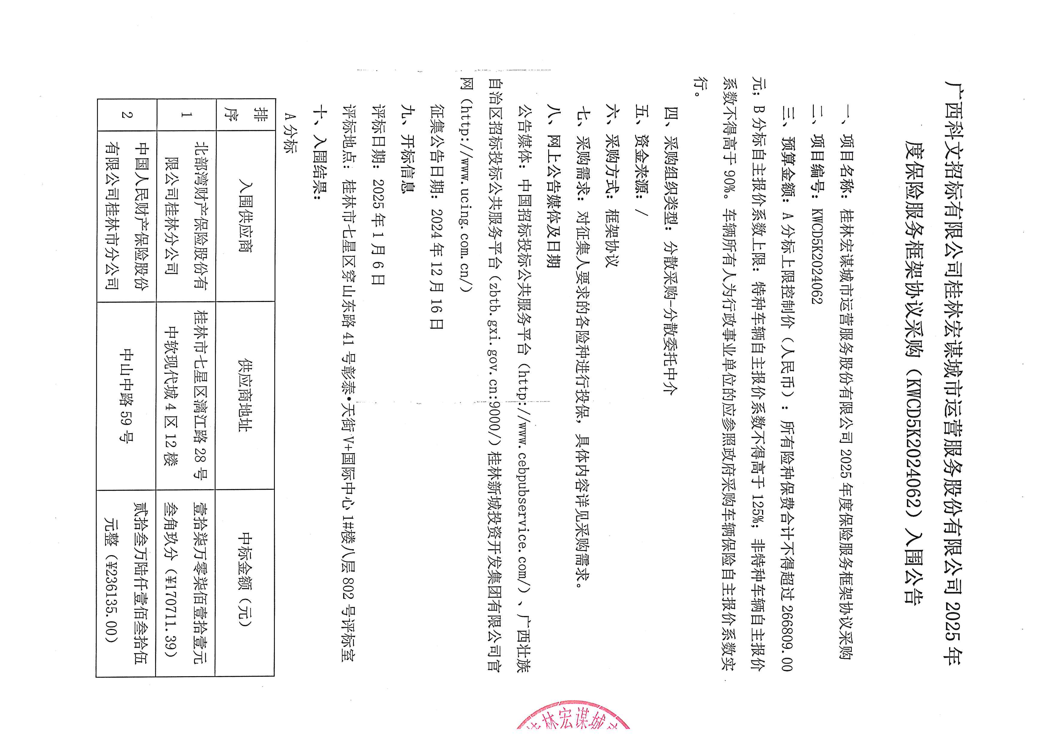 桂林宏謀城市運營服務(wù)股份有限公司2025年度保險服務(wù)框架協(xié)議采購 (KWCD5K2024062)入圍公告