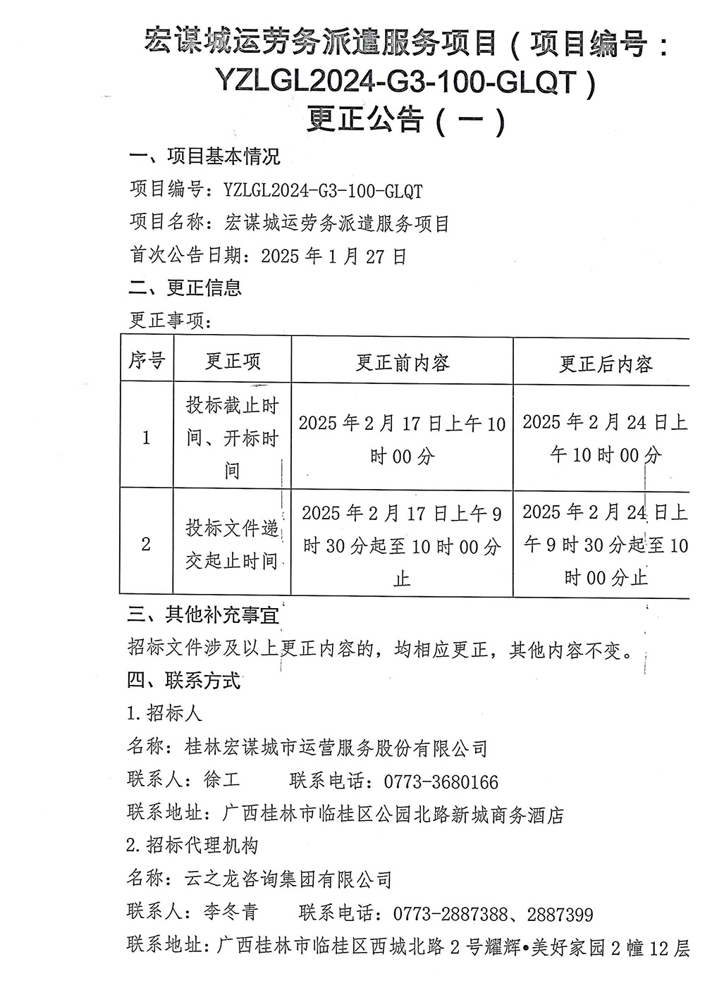 宏謀城運(yùn)勞務(wù)派遣服務(wù)項(xiàng)目(項(xiàng)目編號:YZLGL2024-G3-100-GLQT)更正公告(一)