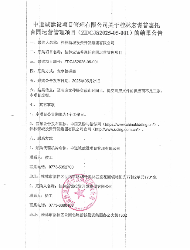 中道誠建設(shè)項(xiàng)目管理有限公司關(guān)于桂林宏謀普惠托育園運(yùn)營管理項(xiàng)目(ZDCJS2025-05-001)的結(jié)果公告